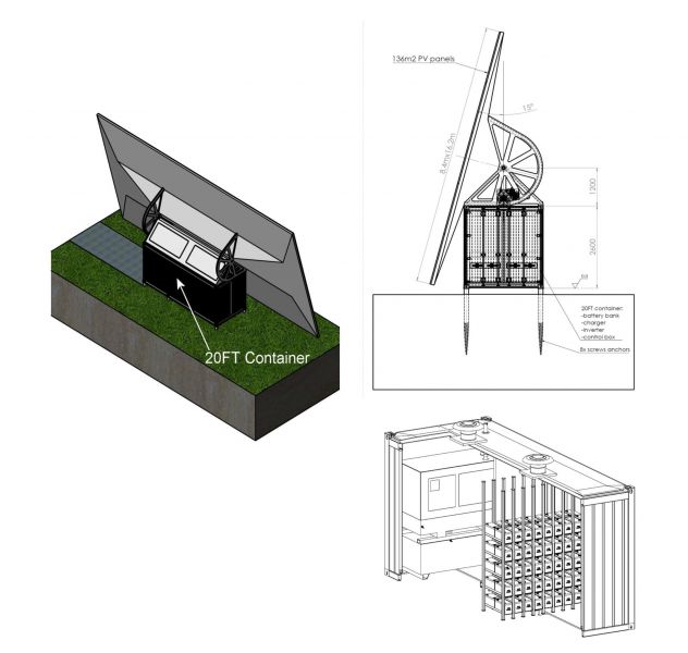 - Tracker (Tracking-System) - Wechselrichter mit maximaler Leistung von 50kW - Kontrollkasten - Batteriespeicher (ca. 8000 Ladungen Zyklen).Gesamtkapazität: 100kWh)